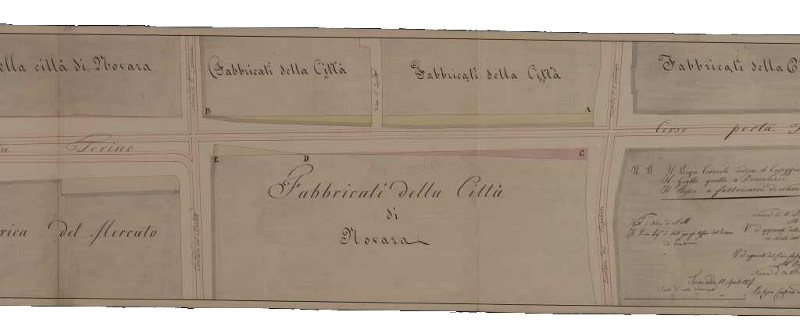 Pianta della Città di Novara - 1858La mappa della città del 1858 evidenzia le importanti modifiche intervenute nella topografia civica, con la rettifica ormai effettuata di tutto il corso Italia, l’ampliamento di corso Cavour con l’espansione urbana verso la stazione, l’apertura di numerose strade verso i baluardi, la costruzione dell’Ospedale e quella della caserma Perrone e la sistemazione dei nuovi portici e del vescovado.