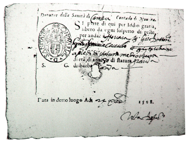 Anche a Novara evidentemente qualche caso si era verificato o comunque si temeva l’arrivo del contagio e quindi la Deputazione di sanità aveva imposto l’uso delle Bollette di sanità per controllare la circolazione di merci e di persone; senza questi documenti che attestavano almeno la apparente salute dei viaggiatori e dei luoghi di partenza non si veniva ammessi all’interno della cerchia delle mura.